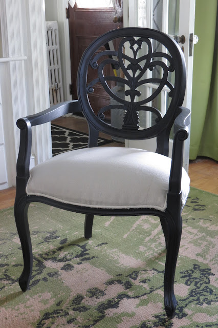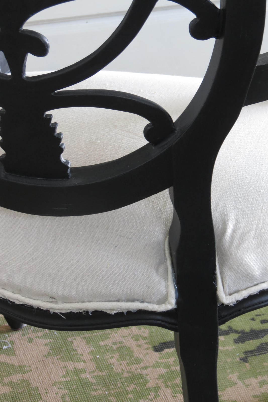 It turned out for the best. As the chair sat there mocking me for not having had enough paint to finish the project I realized she was not ever supposed to be white. I purchased some chalk paint from Lowes in black. This was an expensive can of chalk paint! I wanted to try the product vs. making my own. I don't know that I would do that again. The chair ended up taking three coats. Patience is the name of the game when tackling all the little cut-out area. I kept missing places that I thought I had gotten.