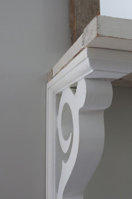 Some pieces are easier to hang than others. My shelf, made from store bought brackets and an old shutter, is one of those pieces. I use a piece of painter's tape to mark where the hangers sit, making sure to line up edges and top of tape to the piece I'm hanging. I use my pencil to punch in holes where the screws should go. I hold the shelf to the wall, making sure it was level, and marked the wall using my chalk. I can then remove the tape and place it along my markings on the wall and drill exactly where the brackets will attach.