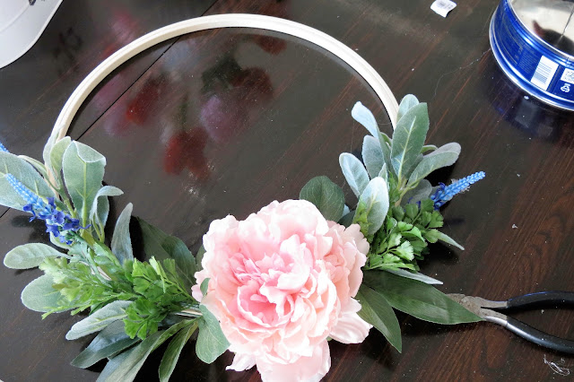 I cut the stems of the lamb's ear to fit my wreath and shaped them to match the curve of the wreath. I cut one smaller than the other as I do not want my wreath symmetrical. Hot glue the base in place and hold in place while cooling to prevent moving. This will be a larger dollop of glue so it will take a minute or two to cool. Use a scissor tip or something pointed to hold in place. You can spot glue a place or two up the side of the wreath.